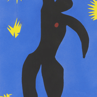 In "Icarus," Matisse presents a black human silhouette against a deep blue background, scattered with bright yellow stars. The figure of Icarus is distinguished by its dramatic posture, with arms and legs extended, symbolizing the mythological fall of the character. The bright red heart on the chest adds an emotional dimension, evoking both courage and vulnerability. The stripped-down forms, typical of the cutting technique, create a dynamic and expressive composition. The work captures both the spirit of freedom and the tragic fate of Icarus, highlighting Matisse’s remarkable ability to evoke complex narratives through apparent simplicity, echoing his constant interest in the relationship between form and background.