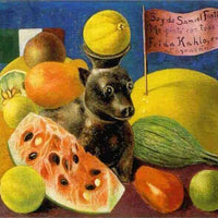 At the centre of the composition is a small black xoloitzcuintle dog, emblematic of Mexico, surrounded by tropical fruit (watermelon, lemon, papaya, melon, orange). A lemon is balanced on its head. In the background is a Mexican flag and a handwritten banner in which Frida dedicates the work to Samuel Fastlicht. The deep blue background and the bright colours of the fruit highlight the round shapes and shiny texture. This still life is more than a decorative representation: it is a declaration of affection, culture and resilience.