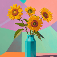 This reinterpretation of ‘Sunflowers’ pays homage to David Hockney's iconic style, with bold geometric shapes and vibrant colours. The sunflowers stand elegantly in an angular turquoise vase, surrounded by a background of coloured blocks in vibrant pastel hues. The play of light and shadow accentuates the simplicity, while evoking a bright, optimistic modernity. This work combines the natural beauty of sunflowers with Hockney's graphic and contemporary aesthetic, creating a composition that is as joyful as it is timeless.