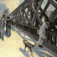 Gustave Caillebotte's The Bridge of Europe captures the effervescence of Parisian life at the end of the 19th century. On this emblematic bridge, elegantly dressed people and workers cross paths, illustrating the mix of social classes characteristic of the period. The metal architecture of the bridge, with its X-shaped structures, creates a play of light and shadow on the pavement, while a dog, a symbol of everyday life, wanders freely.