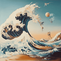 In this surreal metamorphosis, The Great Wave off Kanagawa twists and stretches beyond reality, transporting Hokusai's iconic work into a disturbing dream world. The sea, in perpetual distortion, seems to defy the laws of physics, its crest fraying into ethereal wisps that rise towards an unreal sky. Liquid forms float in the air, while soft clocks and fragments of boats appear frozen in an uncertain temporality. Foam takes on an organic appearance, merging with the atmosphere in a dialogue between solid and liquid. Mount Fuji, for its part, rises out of a dreamy desert landscape, reinforcing the sensation of a world suspended between the tangible and illusion. This revisited wave, in which time stretches and space curves, illustrates the hypnotic power of Dalinian surrealism, transforming Hokusai's frozen moment into a moving, elusive vision.Comparez avec l’original
