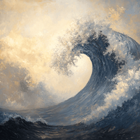 Under the inspired brush of William Turner, Hokusai's The Great Wave off Kanagawa is transformed into a storm of light and movement. The windswept foam seems to dissolve into a golden mist, where sky and sea merge in a symphony of contrasts. The whole captures an almost supernatural energy, where the power of water becomes a pictorial element imbued with mystery and grandeur.Comparez avec l’original