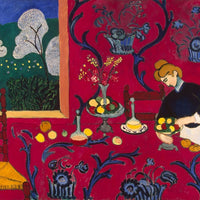 Visually, the painting is dominated by a sumptuous red hue that fills the space, a bold choice that immediately captures attention. The composition features a table set with fruits and everyday objects, surrounded by a sinuous plant motif adorning the walls and the tablecloth. The simplified contours and flat colors give the scene a sense of two-dimensionality, enveloping the viewer in a warm and vibrant atmosphere. The contrast between the intense red, the green of the leaves, and the touches of blue and yellow on the objects creates a dynamic visual harmony, prompting a reflection on the everyday transformed into visual poetry.
