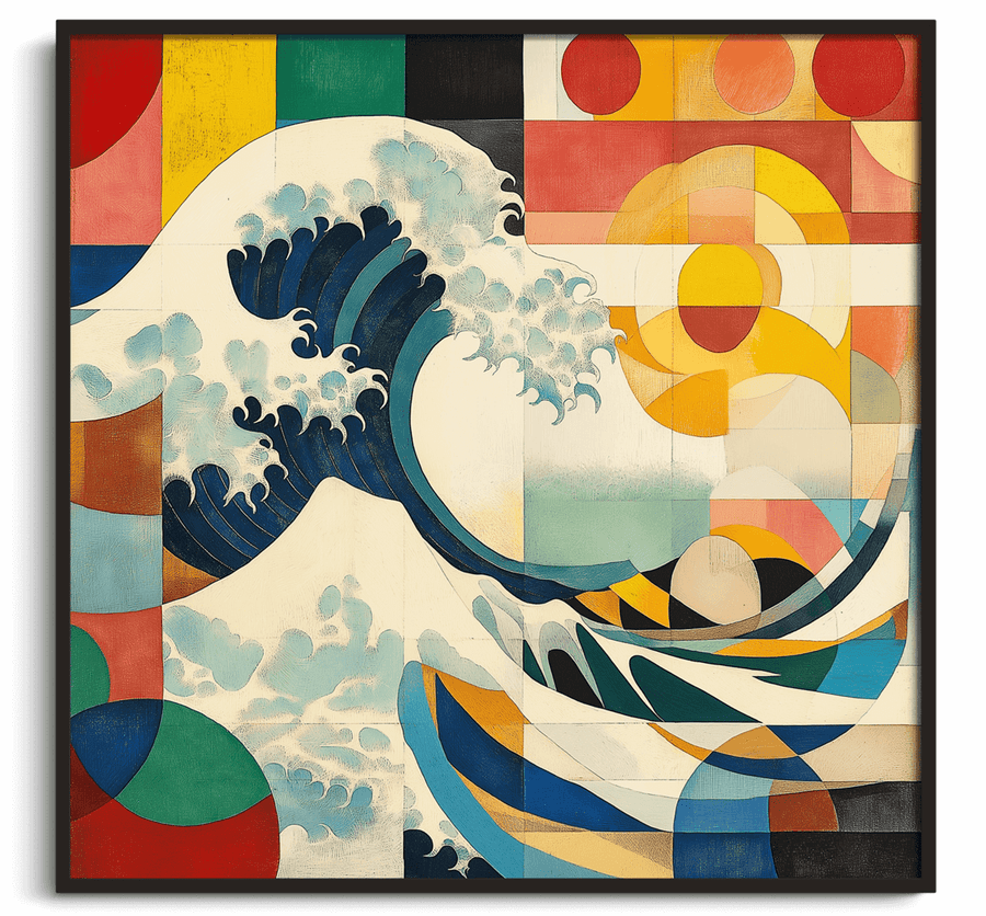 Cette version réinterprète La Grande Vague de Kanagawa avec une approche géométrique et colorée inspirée de Robert Delaunay. Les mouvements de l’eau se décomposent en cercles et en formes fragmentées, tandis que la lumière se diffuse en aplats vibrants. Le dynamisme de la scène est amplifié par une palette éclatante, où les nuances s’entrelacent en une danse rythmée. L’horizon et l’océan fusionnent dans une abstraction harmonieuse, transformant l’énergie brute de la vague en une symphonie visuelle où chaque couleur semble pulser d’un mouvement propre.