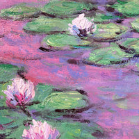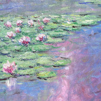 Les Nymphéas est une série d'environ 250 peintures impressionnistes, représentant le bassin de nénuphars dans le jardin de fleurs de l'artiste à Giverny. Cette œuvre de Claude Monet est baignée de vert émeraude sombre, ponctué de touches rondes, soufres et violines claires. La concentration du paysage à un espace restreint, permet d’en tirer toute l'intensité. Pour ainsi dire, l'artiste opère une double mise au point, à la fois sur la profondeur abyssale de l’eau et sur ce qui flotte en surface.
