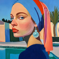 In dieser gewagten Neuinterpretation wird Vermeers „Das Mädchen mit der Perle“ in die farbenfrohe und grafische Welt von David Hockney entführt. Die klassische Eleganz des jungen Mädchens harmoniert mit einer zeitgenössischen Ästhetik: Klare Linien, vibrierende Farbtöne und strahlendes Licht erinnern an eine sonnenverwöhnte Szene an einem kalifornischen Swimmingpool. Die Perle, eine zeitlose Ikone, funkelt in dieser modernisierten Welt, während der stechende Blick des Mädchens seine geheimnisvolle Tiefe behält. Eine fesselnde Verschmelzung von Tradition und Moderne, die das Genie der beiden Künstler feiert.