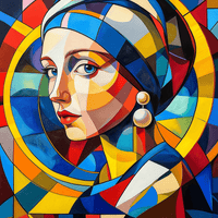 Tauchen Sie ein in eine helle und dynamische Neuinterpretation von „Das Mädchen mit der Perle“, die durch das strahlende Prisma des Stils von Robert Delaunay verwandelt wurde. Vermeers klassisches Porträt erstrahlt in geometrischen Formen und leuchtenden Farben, die typisch für den orphischen Kubismus sind. Jede Facette des Kunstwerks wird zu einem Fenster in ein vibrierendes Spiel aus Licht und Bewegung, das die Perle als Gleichgewichtspunkt in diesem Farbenwirbel verherrlicht. Eine moderne, abstrakte Feier, die die Epochen überwindet und Tradition und Avantgarde mit packender Energie verschmilzt.