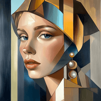 Inspiriert von Tamara de Lempickas glamourösem und geometrischem Stil, verbindet diese Interpretation von Vermeers „Das Mädchen mit der Perle“ klassische Eleganz mit der Moderne des Art Déco. Die kühnen Linien und eckigen Formen, die für Lempickas Werk charakteristisch sind, sind subtil integriert und verleihen dem Mädchen einen Blick, der von Raffinesse und Geheimnis geprägt ist. Die metallischen Töne und der goldene Schimmer betonen die Sinnlichkeit des Ganzen und verwandeln das Gemälde in eine raffinierte Hommage an Lempickas unverwechselbaren Stil und ehren gleichzeitig die Zeitlosigkeit von Vermeers Originalwerk.