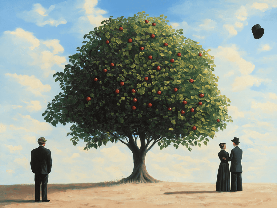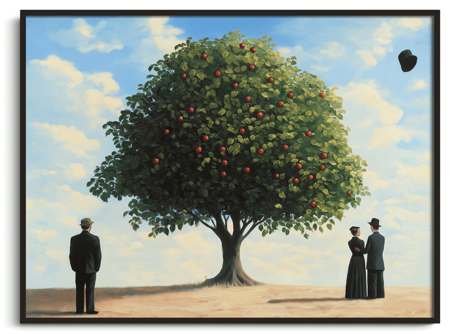Unter einem klaren Himmel, in dem unsichtbare Fragen schweben, erhebt sich der Lebensbaum wie ein friedliches Rätsel. Mit roten Äpfeln bedeckt, erinnert er an die Allegorie des Verlangens und des Wissens, hier jedoch eingefroren in einer Szene, die fast zu ruhig ist, um real zu sein. Figuren stehen regungslos da, wie in einem Gedanken gefangen. Einem Hut entweicht, die Schwerkraft herausfordernd, während die Zeit stillzustehen scheint. Der Einfluss von Magritte verwandelt diesen Baum in ein stilles Symbol: das Symbol dessen, was sich unserem Verständnis entzieht, verborgen hinter der scheinbaren Einfachheit.Comparez avec l’original