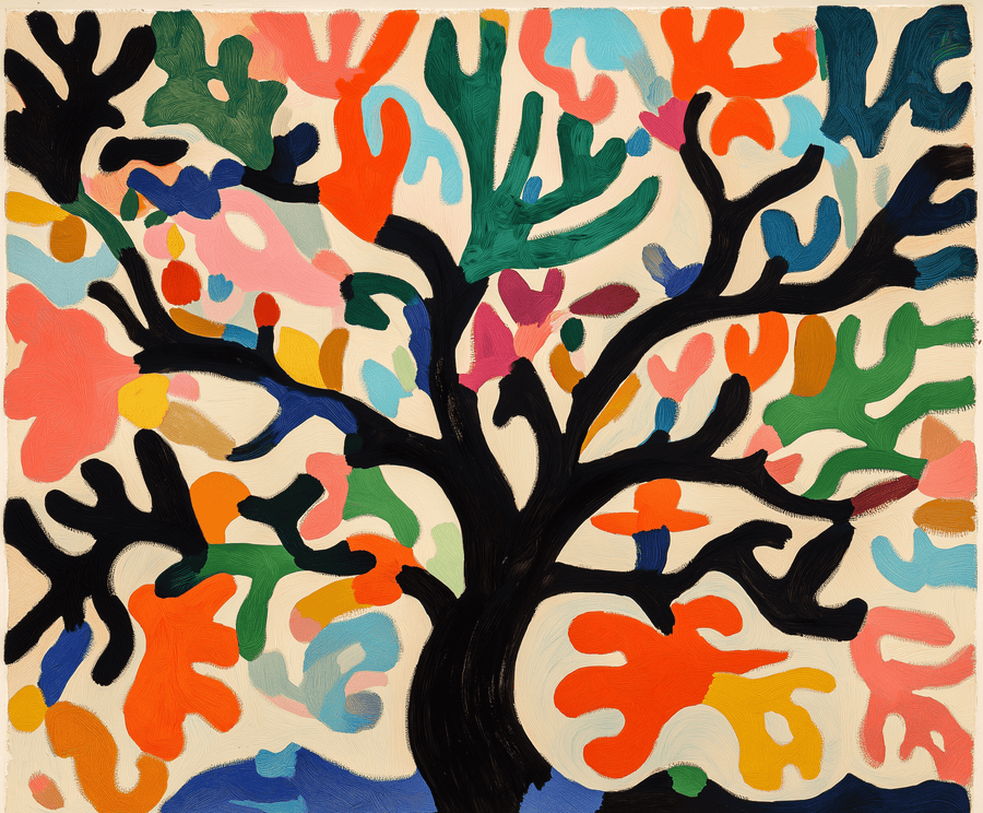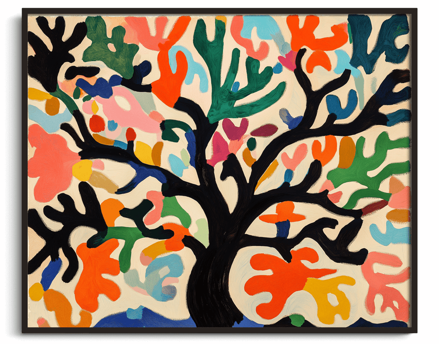 In dieser vibrierenden Neuinterpretation nimmt der Lebensbaum die Gestalt eines lebendigen Scherenschnitts an, der in klaren Farben und freien Formen erstrahlt. Jedes Blatt, inspiriert von der Palette von Matisse, feiert die Spontaneität der Geste und die pure Freude. Hier wird die Natur zu einer fröhlichen Abstraktion, einer Ode an die kreative Freiheit und das Leben in Bewegung.Comparez avec l’original